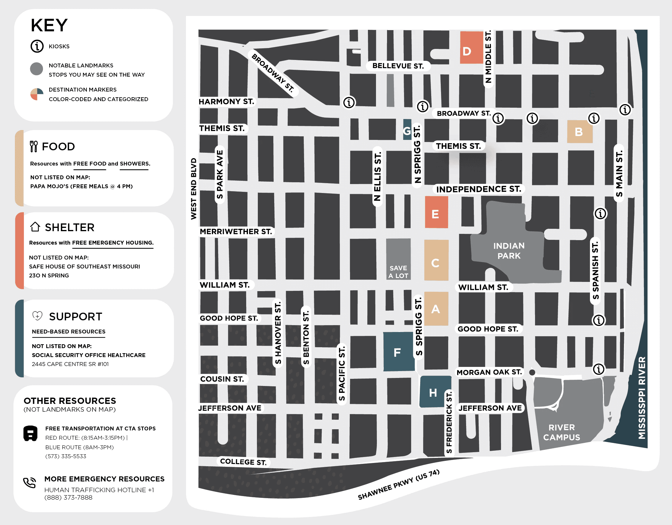 I started by mapping existing services across Cape Girardeau, including shelters, food distribution, and mental health resources, and grouped them into clear categories. Each category got a distinct color so users could navigate quickly, regardless of literacy level or cognitive ability.