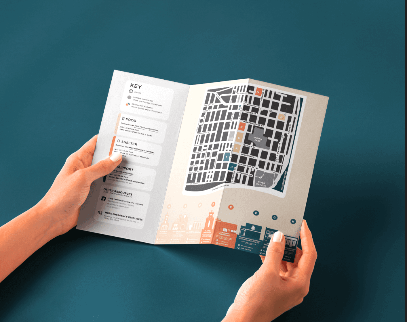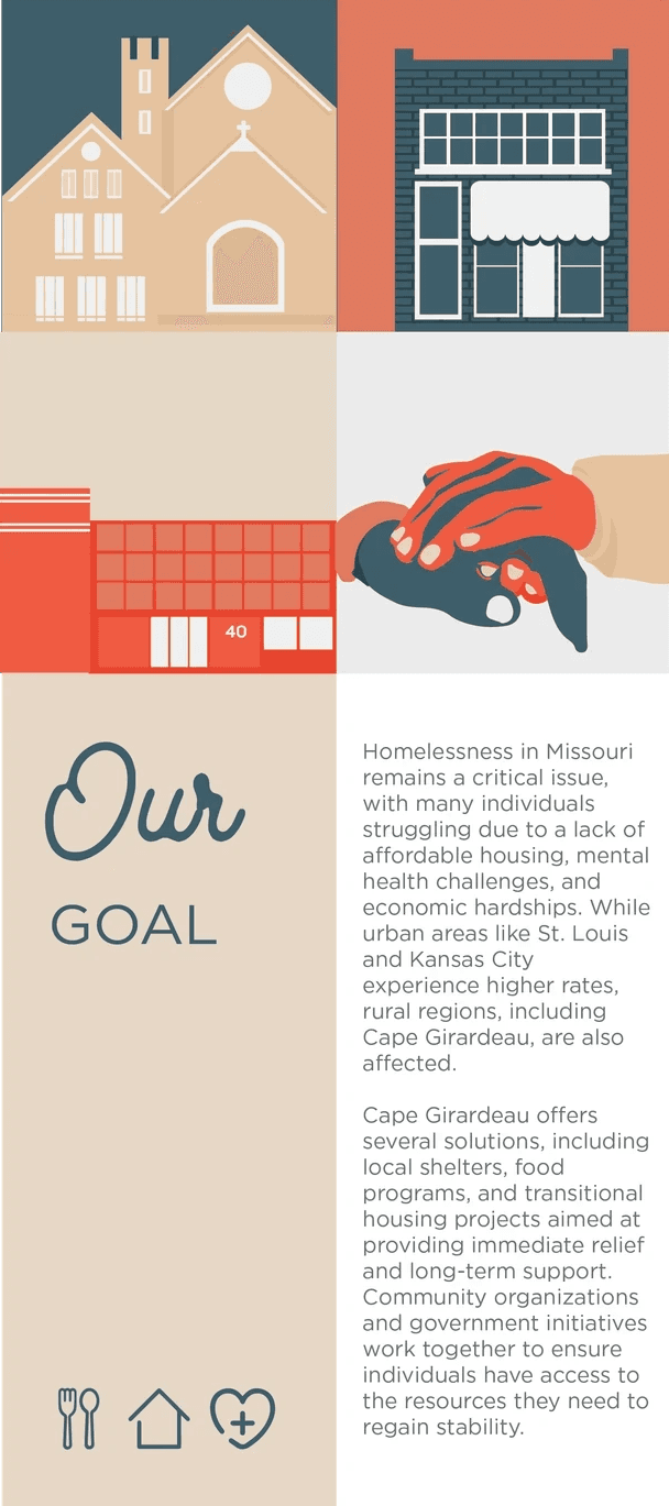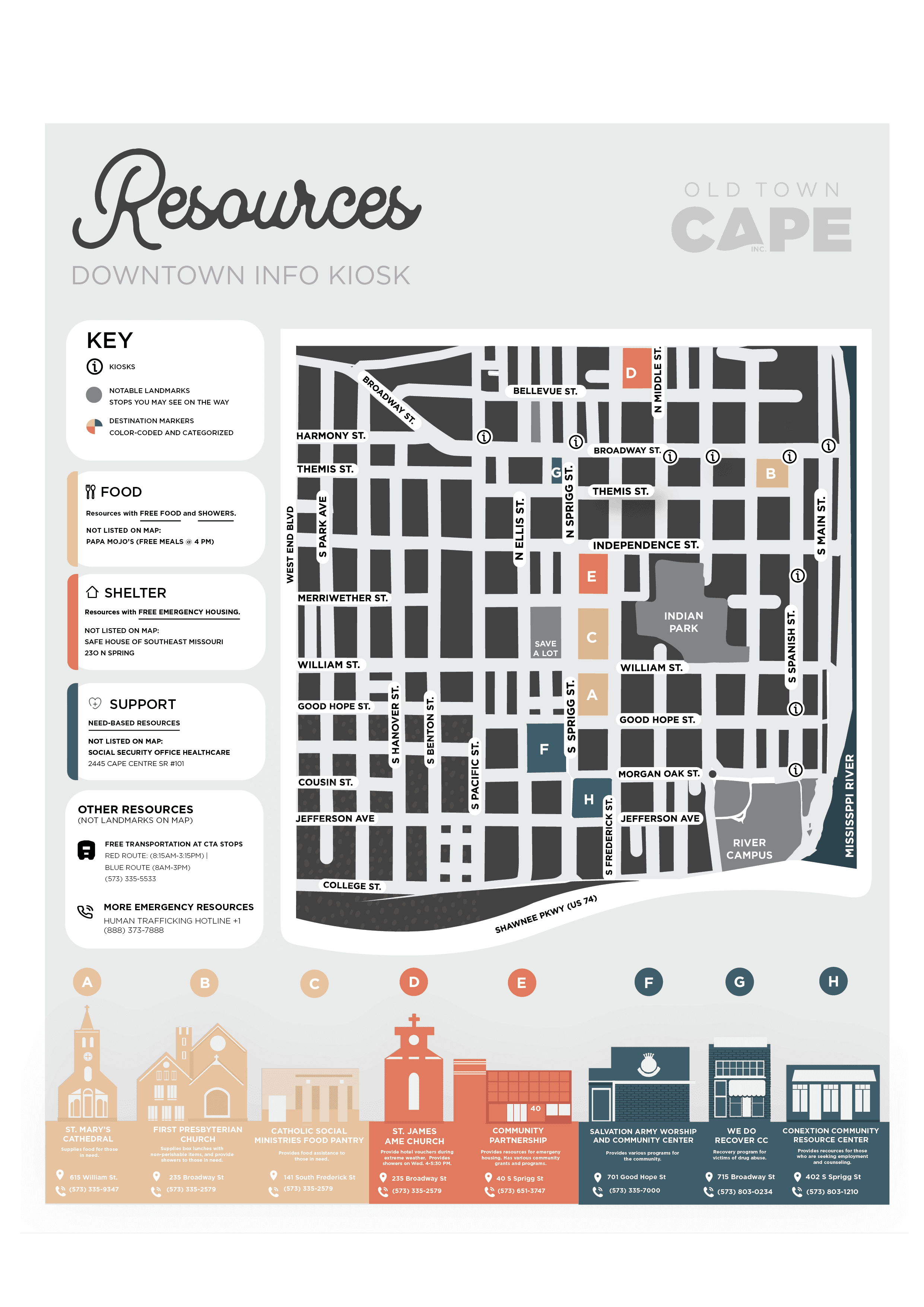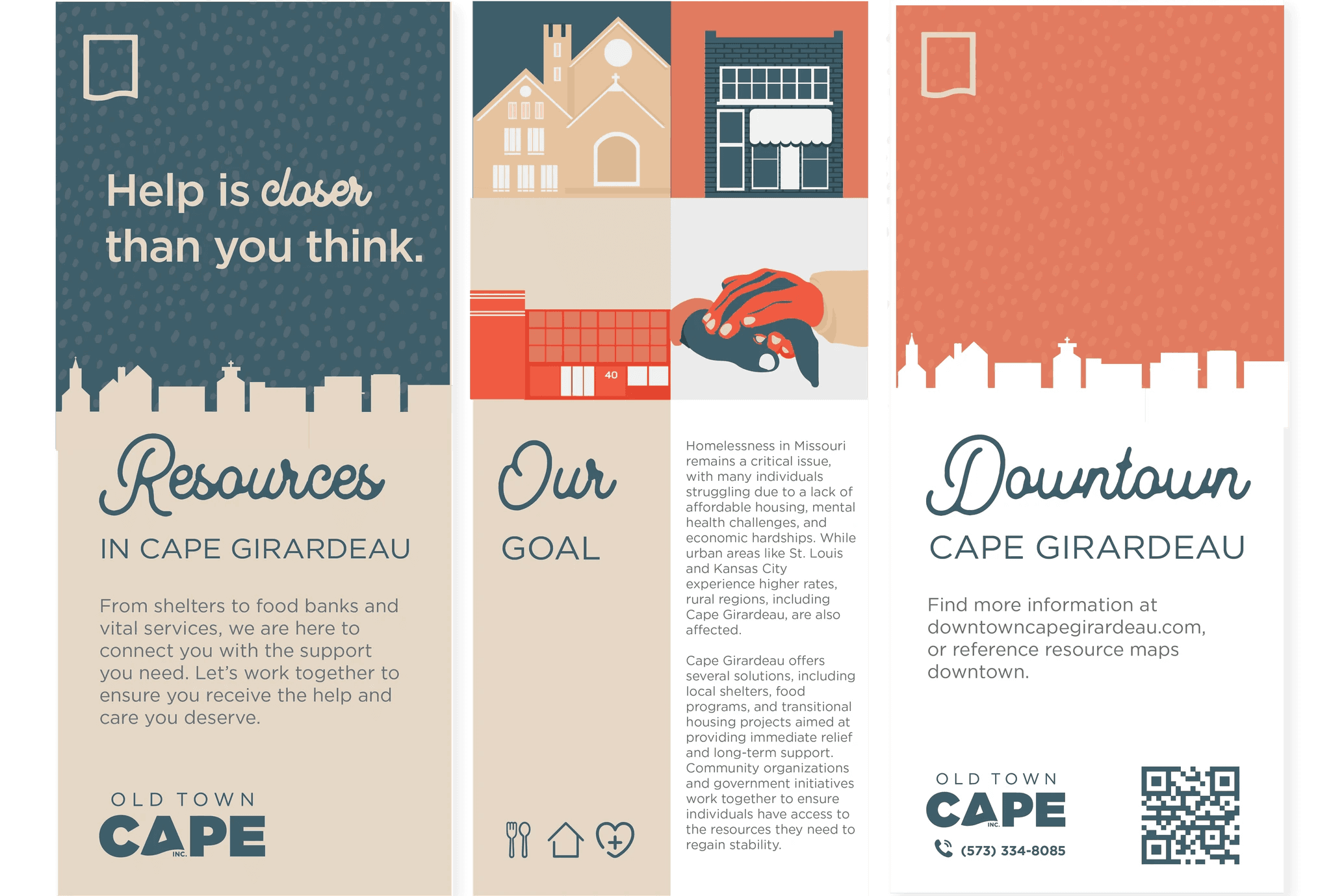 Cape Girardeau faces a significant challenge with homelessness, where many individuals are unaware of the valuable resources the city has to offer. Recognizing this gap, I set out to design a solution that could effectively reach those in need, including individuals with low literacy, visual impairments such as color blindness, and other accessibility barriers. To ensure the information was widely accessible, I created a detailed resource map, a poster campaign, and informational brochures aimed at increasing awareness and guiding people to support services.