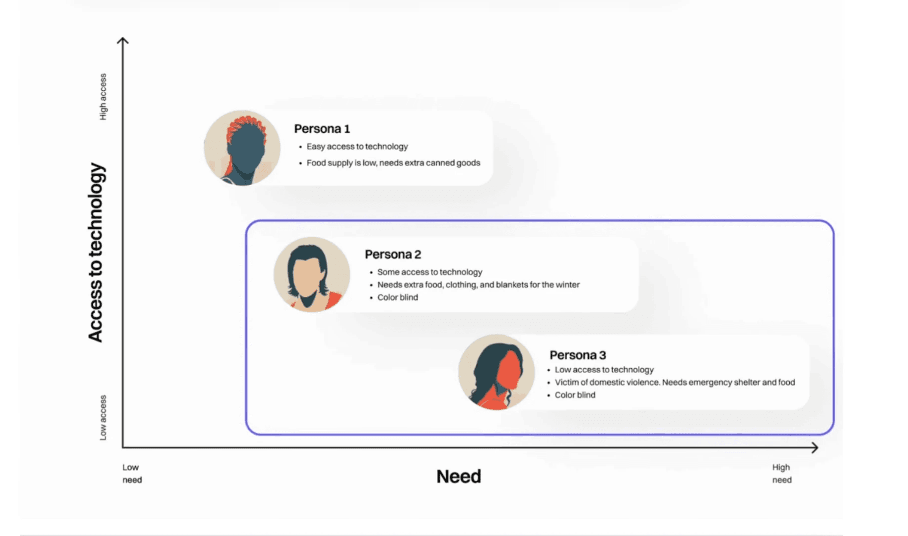 Three personas captured the range of needs. Mapping confirmed the core gap: kiosks sat in high-traffic areas but nowhere near actual services, and people moved well beyond the mapped zone.